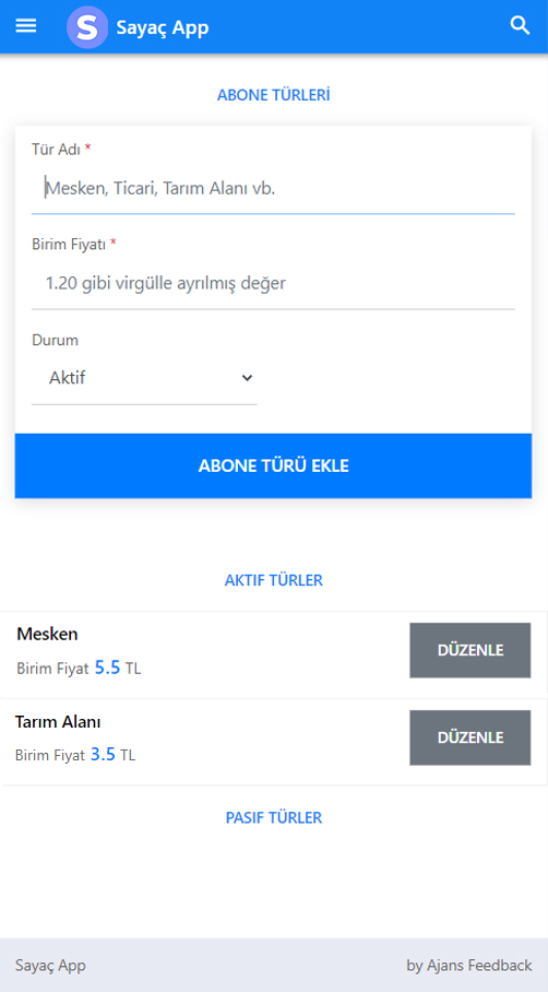 Abone türüne göre farklı birim fiyatlar uygulayabilirsiniz. Örneğin; Mesken için 5TL, Ticarethane için 6TL