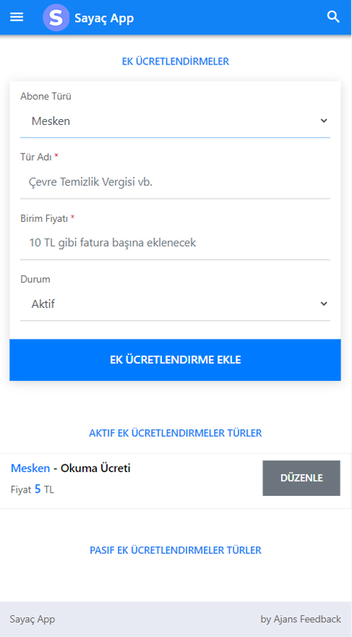 Abone türüne göre ek ücretler tanımlayabilirsiniz. Örneğin; Mesken için 3TL Tarım alanı için 4 TL okuma bedeli.